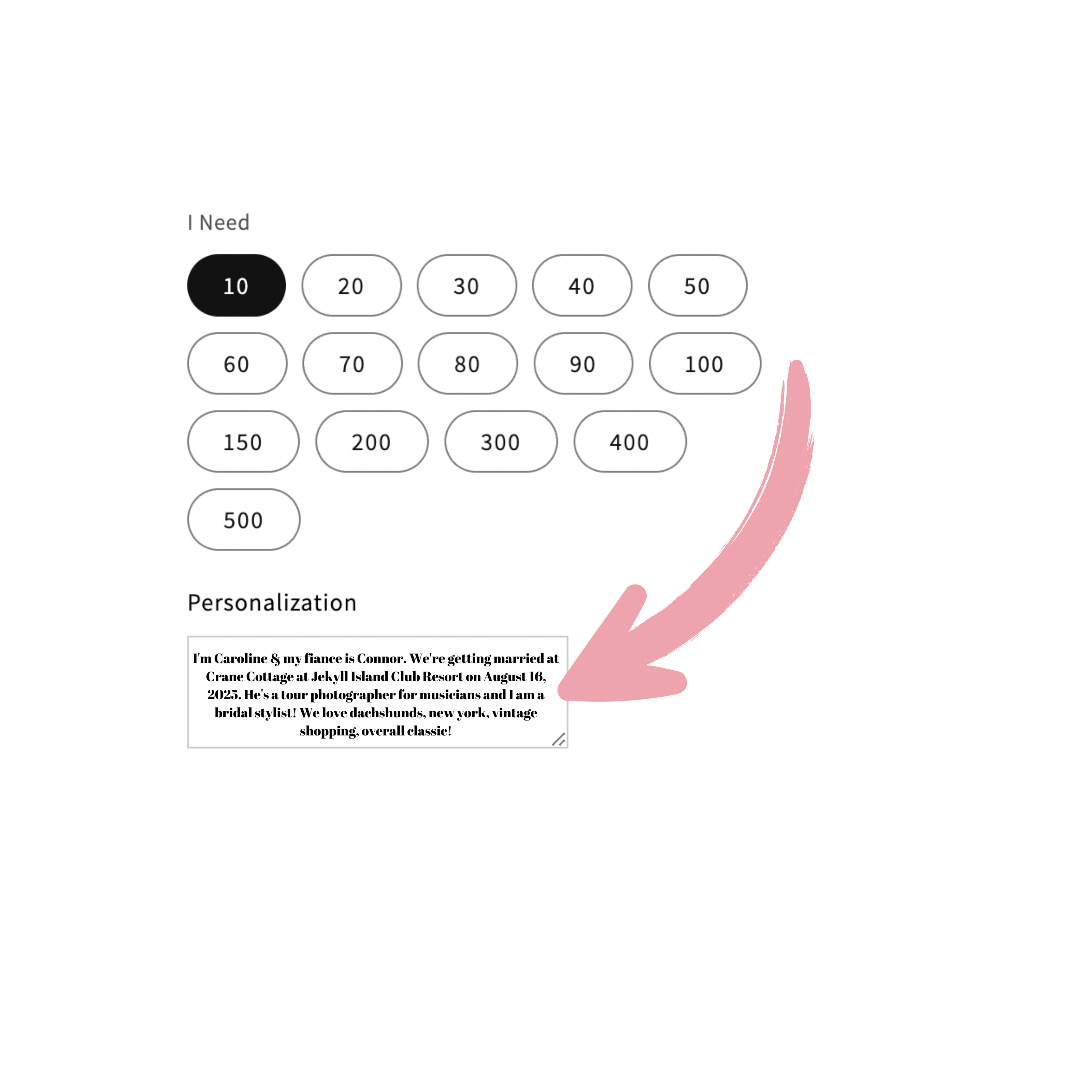 Once you have selected the quantity, we kindly ask you to write your requests in the personalization section. But don’t worry—if you don’t enter them there, we will reach out to you via email right after your order to gather all your ideas and details regarding your request!